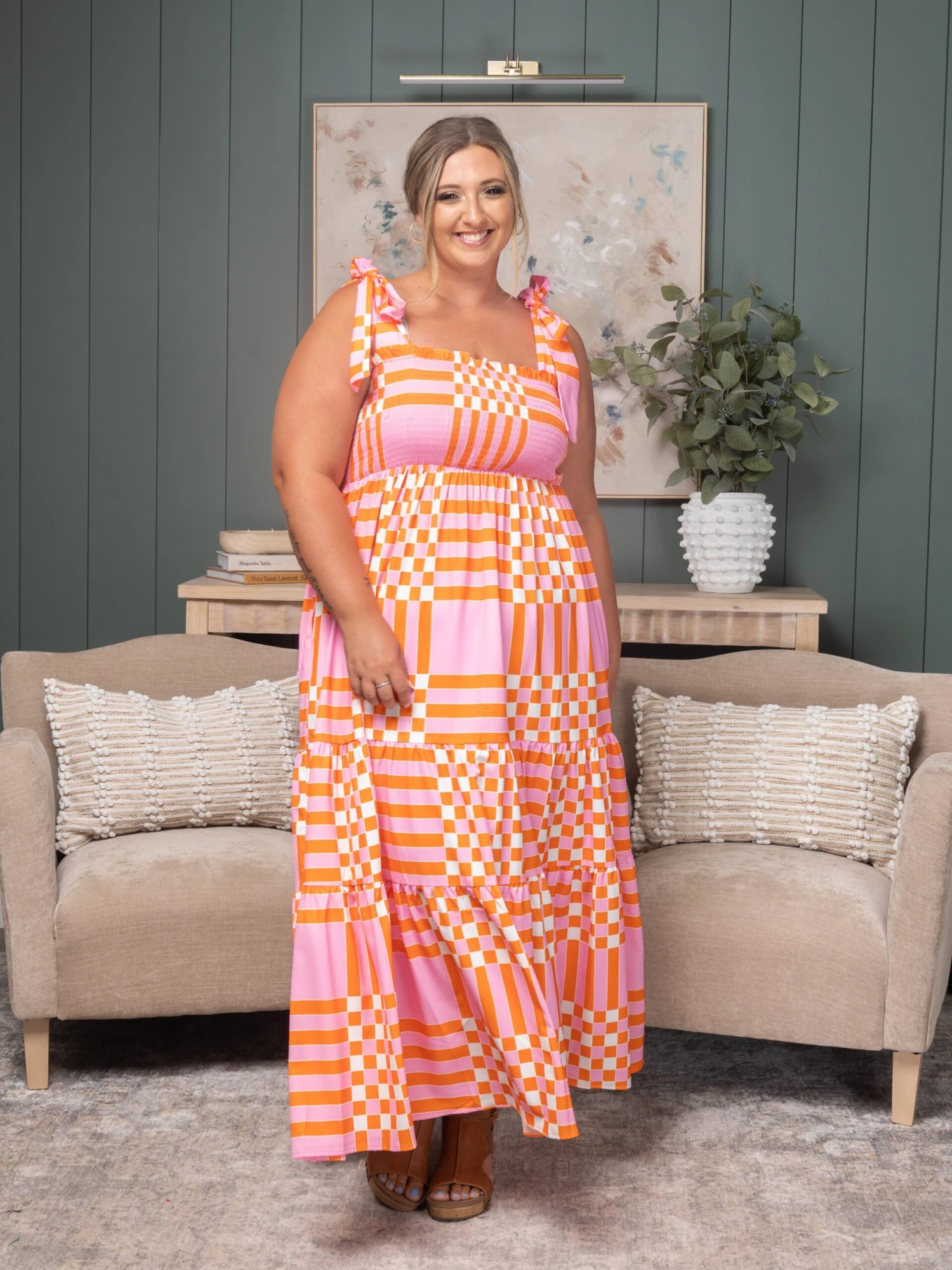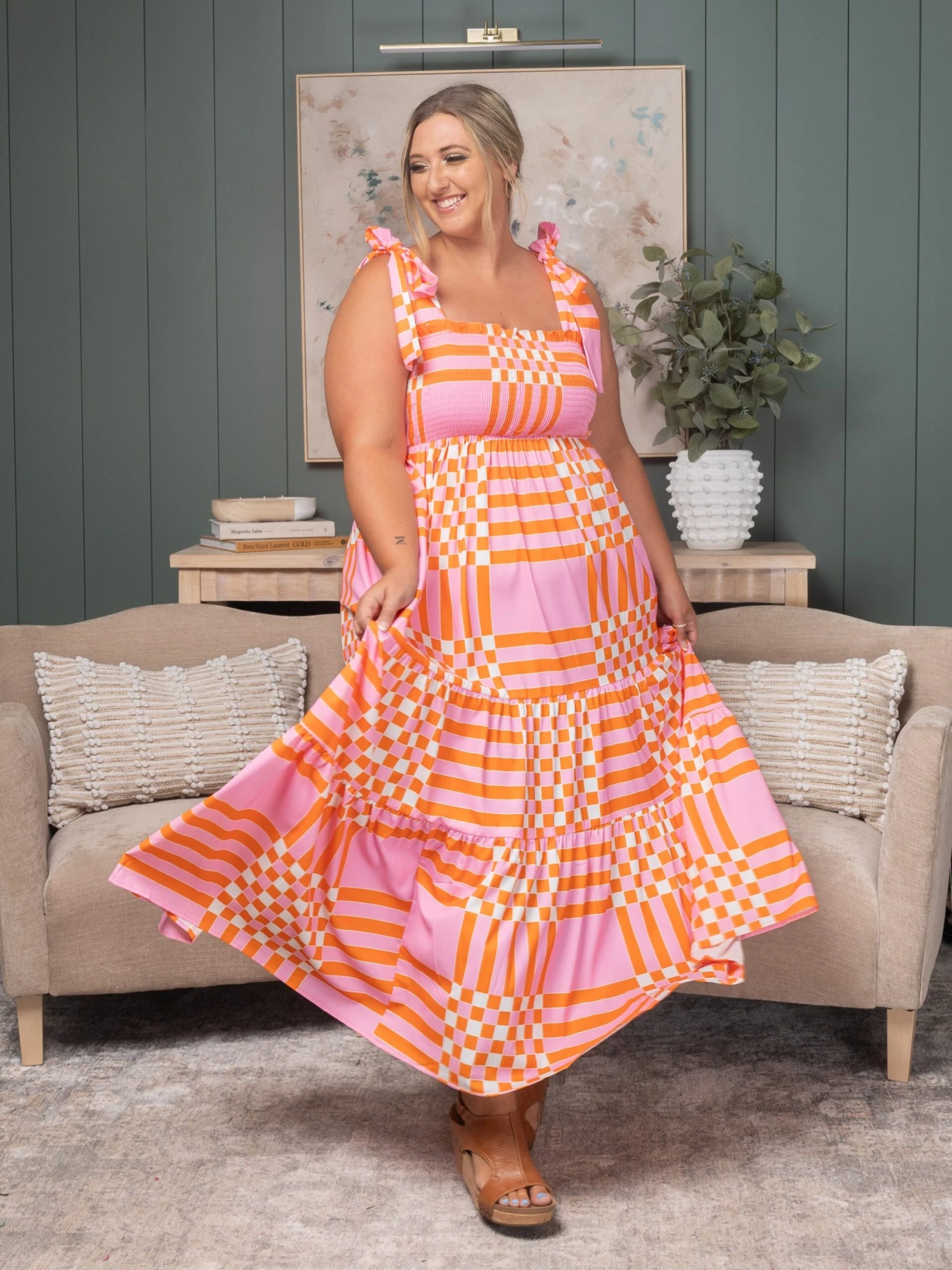 Features: Tie Straps, Smocked, Gingham Print