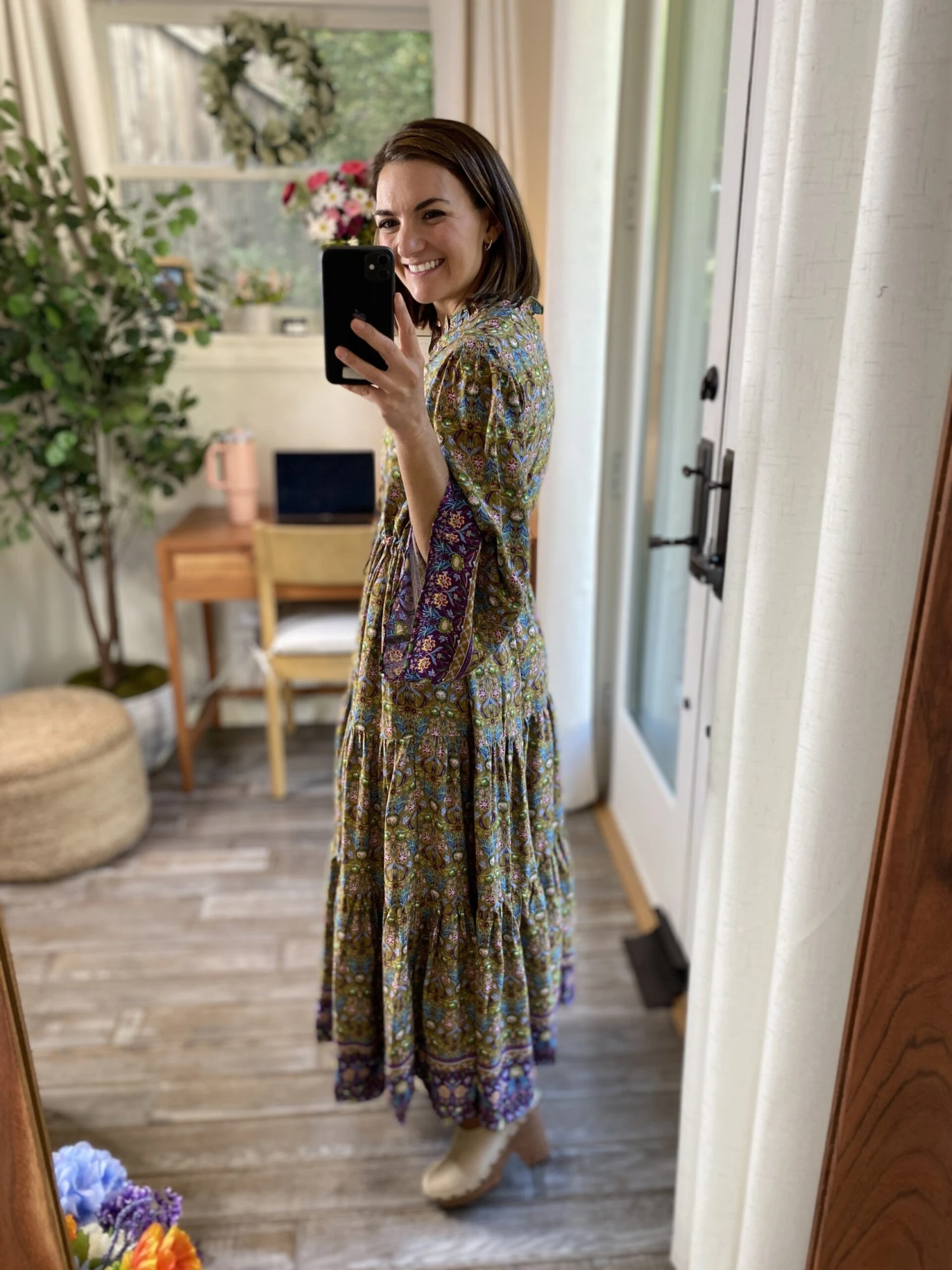 Features: floral print, summaryed bust, long sleeve, tied waist