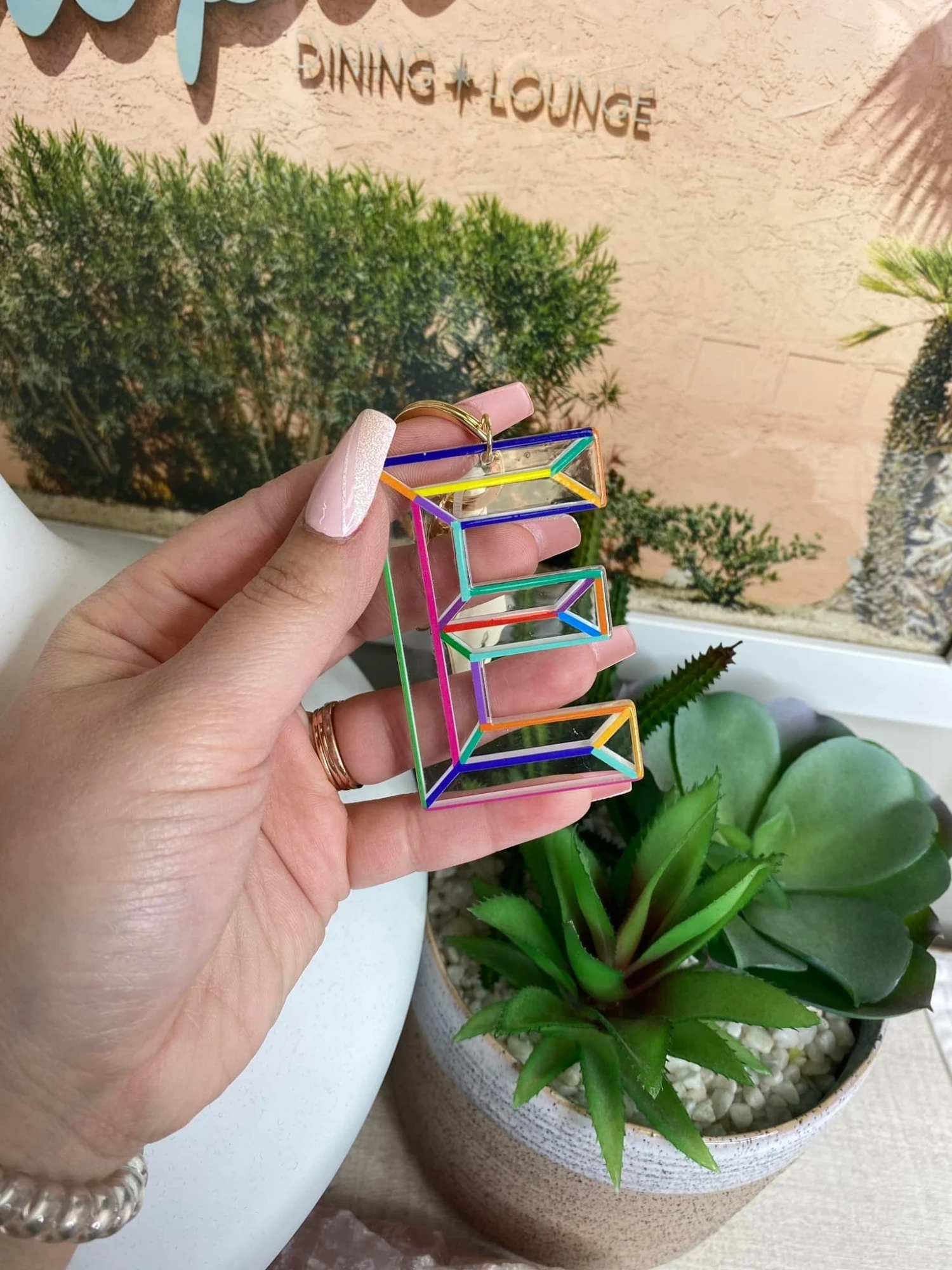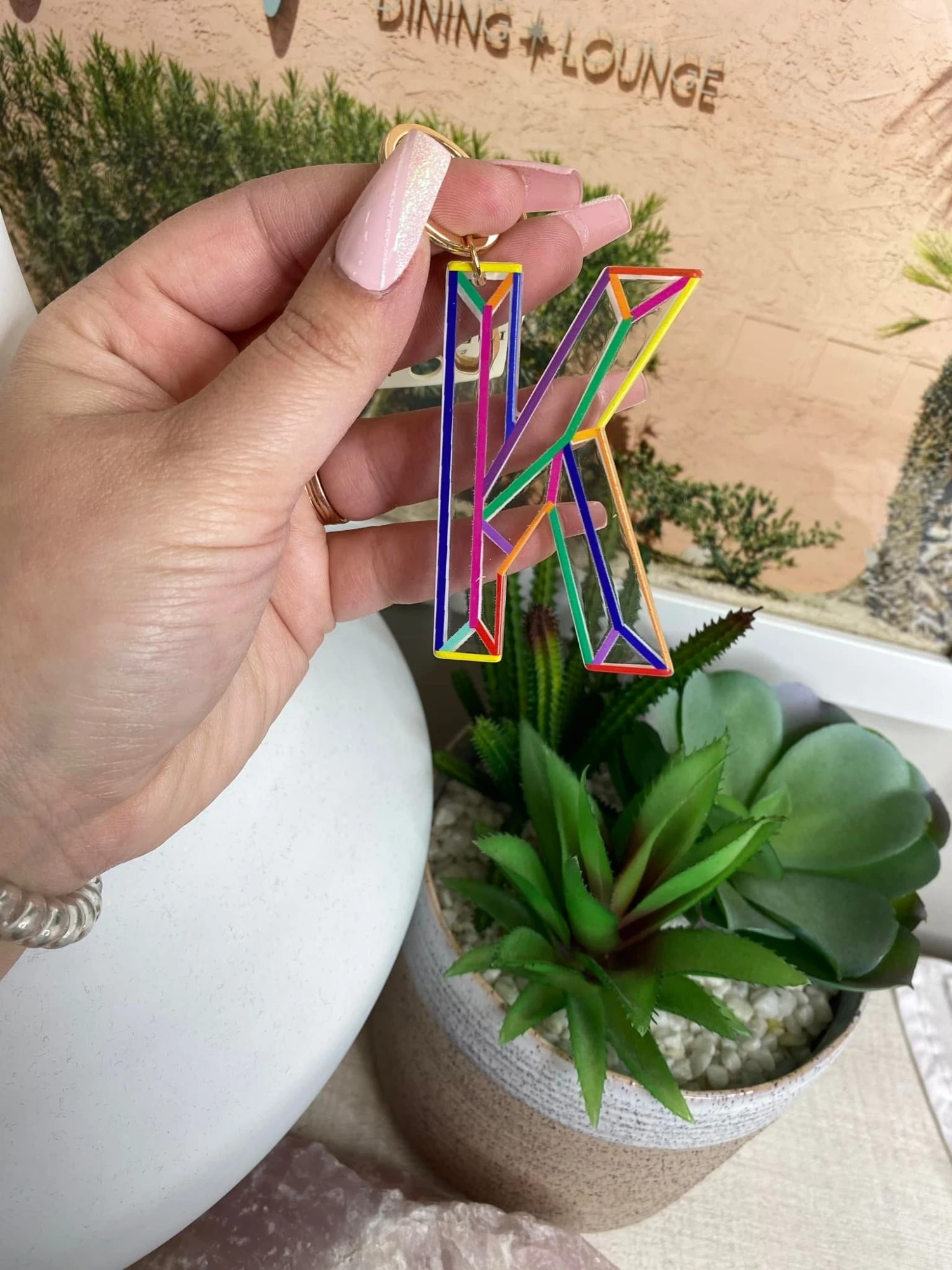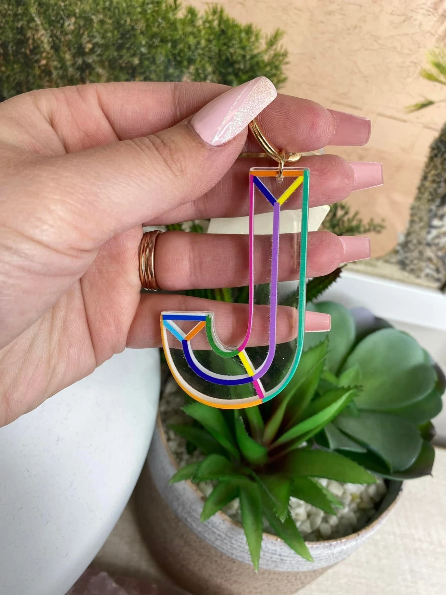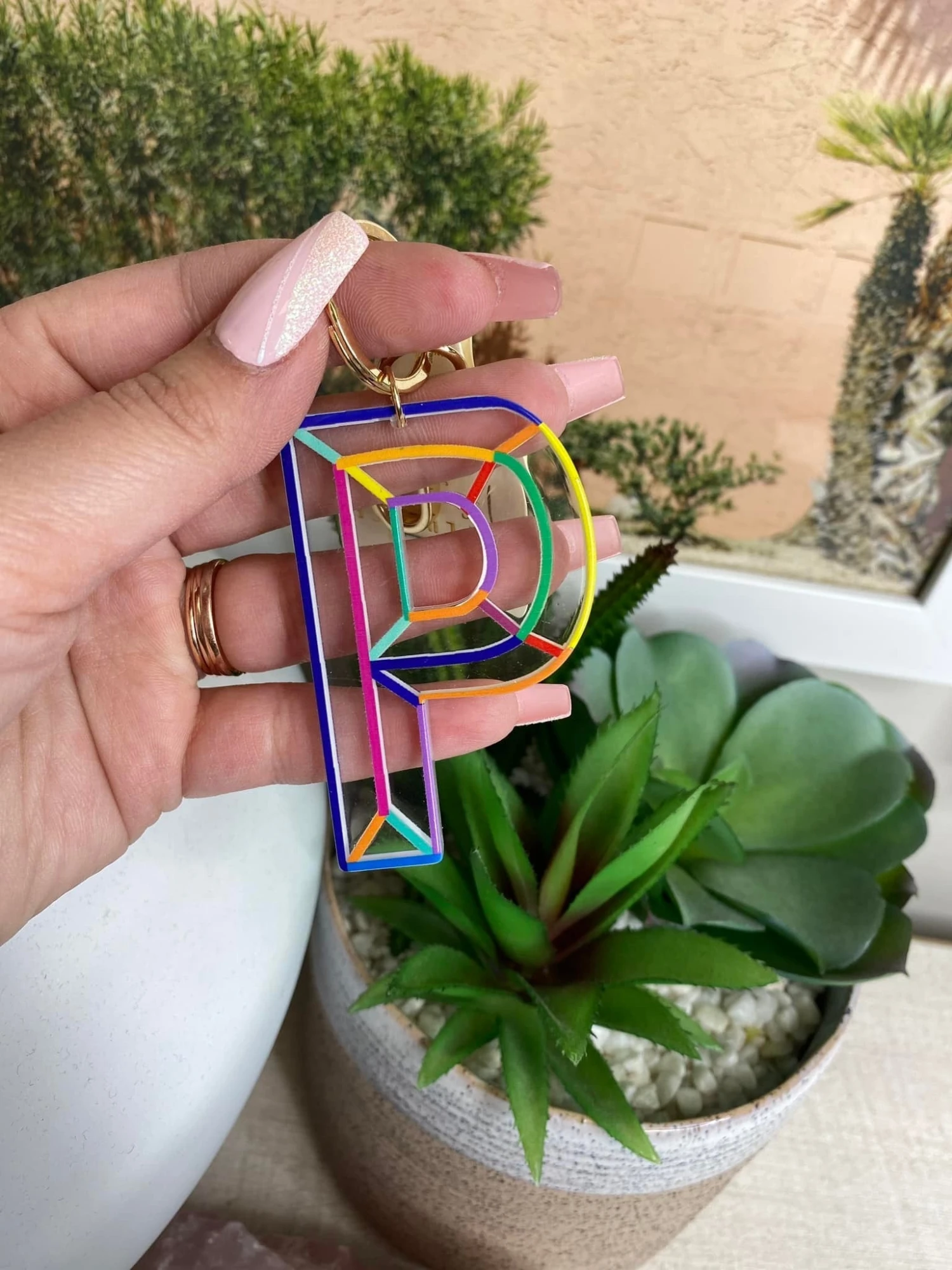 Features: Gold Charm Bag Key Ring, Multi Color Initial