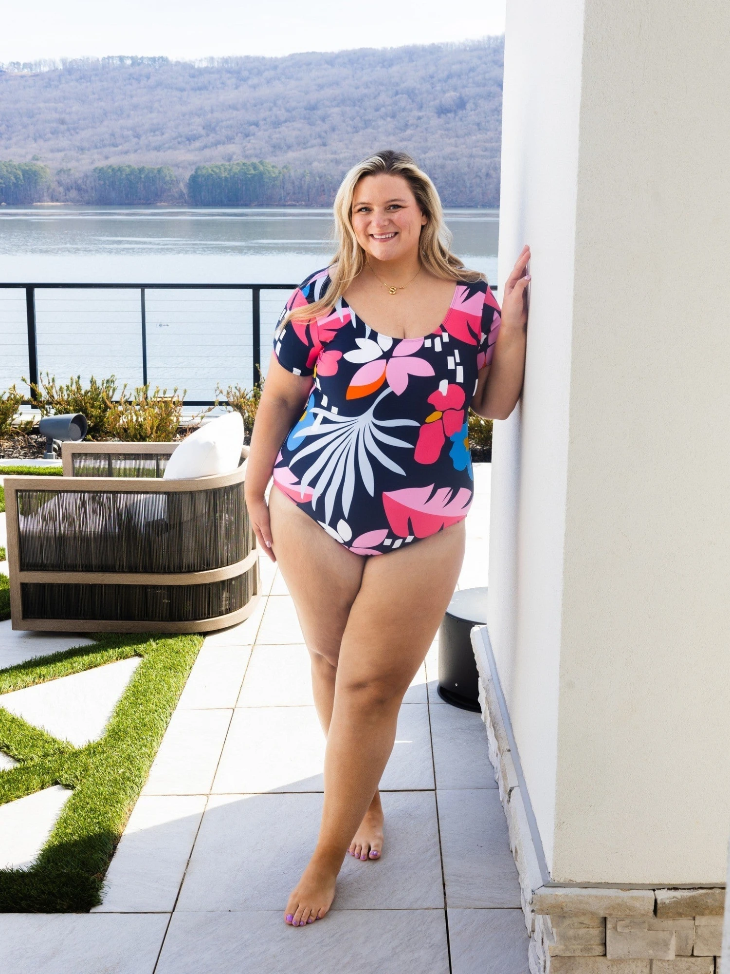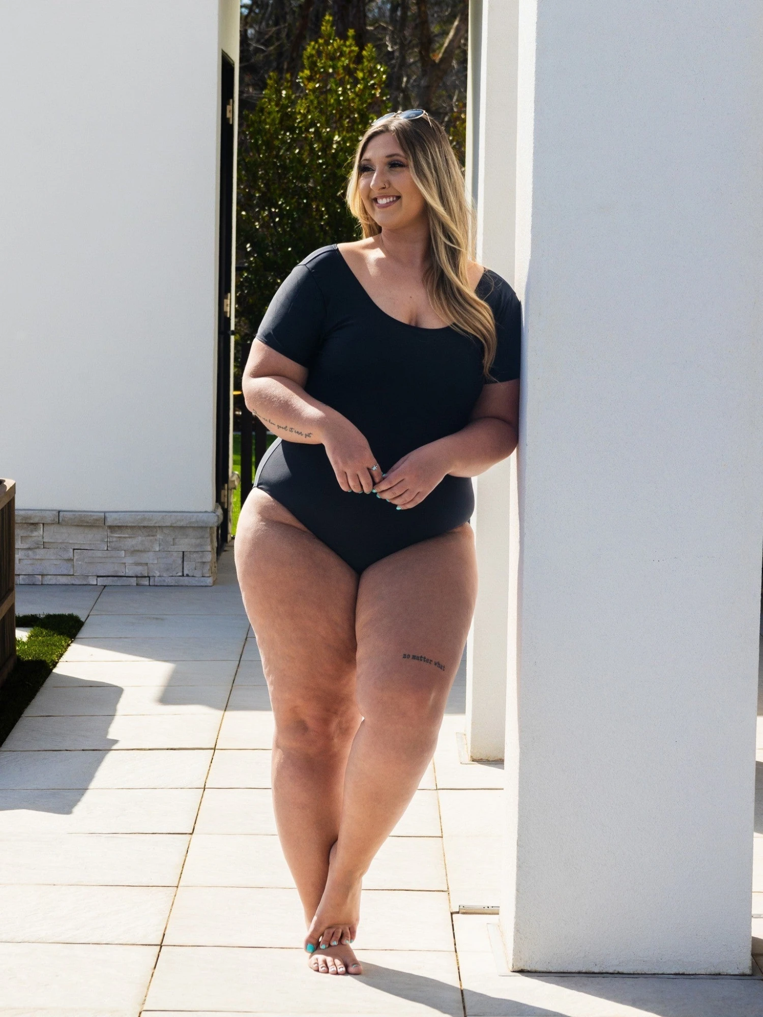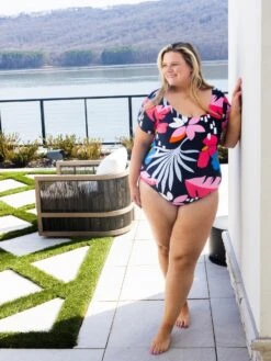 Erin is 5’9, 36C bra, typically wears size L/XL in tops and 14/16 in denim. Wearing size XL. This suit offers great tummy control and coverage. Perfect for on the go and looks adorable with a pair of shorts!