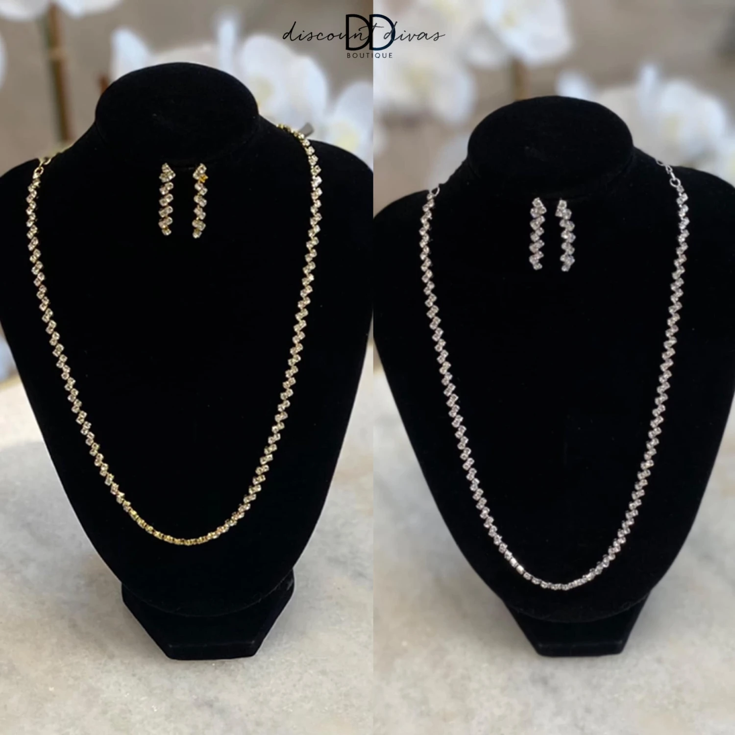 Features: Rhinestones, Dangle earrings, Necklace, 3″ Extender