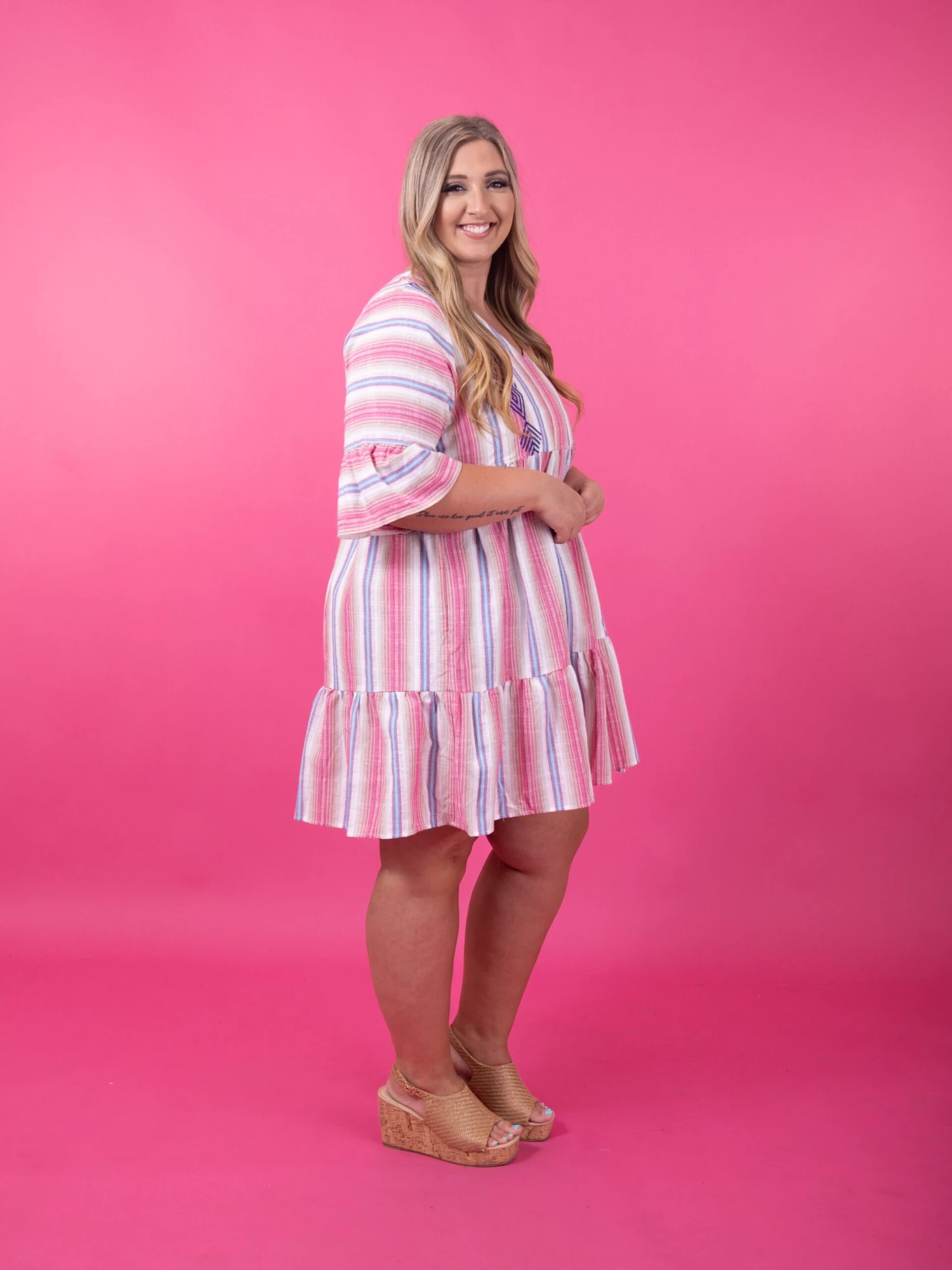 Features: Embroidery, Babydoll, V-Neck, Short Sleeve, Striped