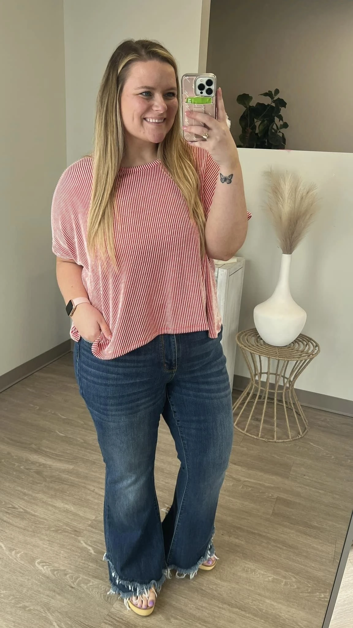 The “Explaining Me Flare” is here for you! This high waisted design is just what your wardrobe has been asking for! With a stylish tulip hem design, you know these will have you looking so good! Snag a pair before they sell out, you know they will!