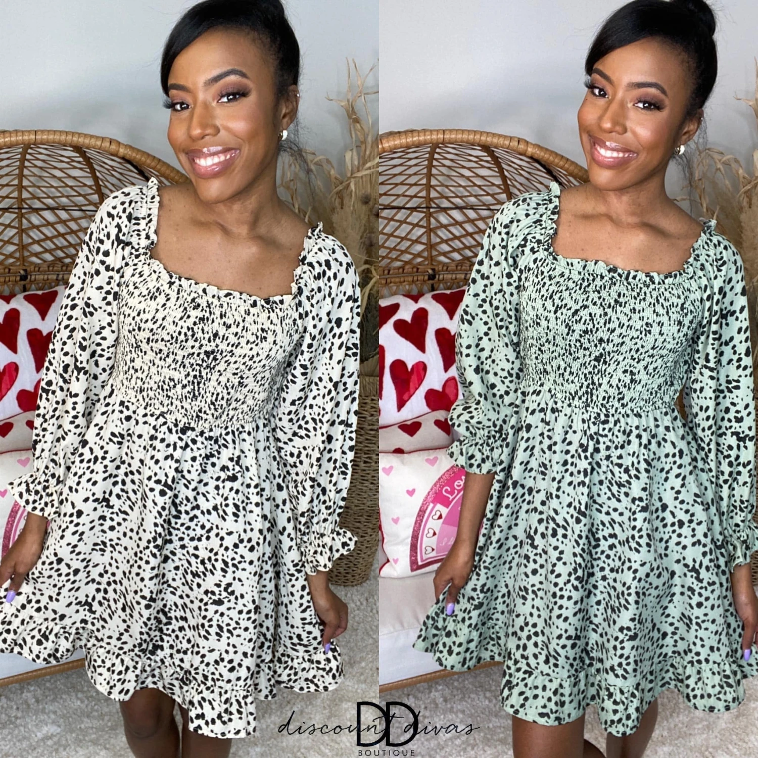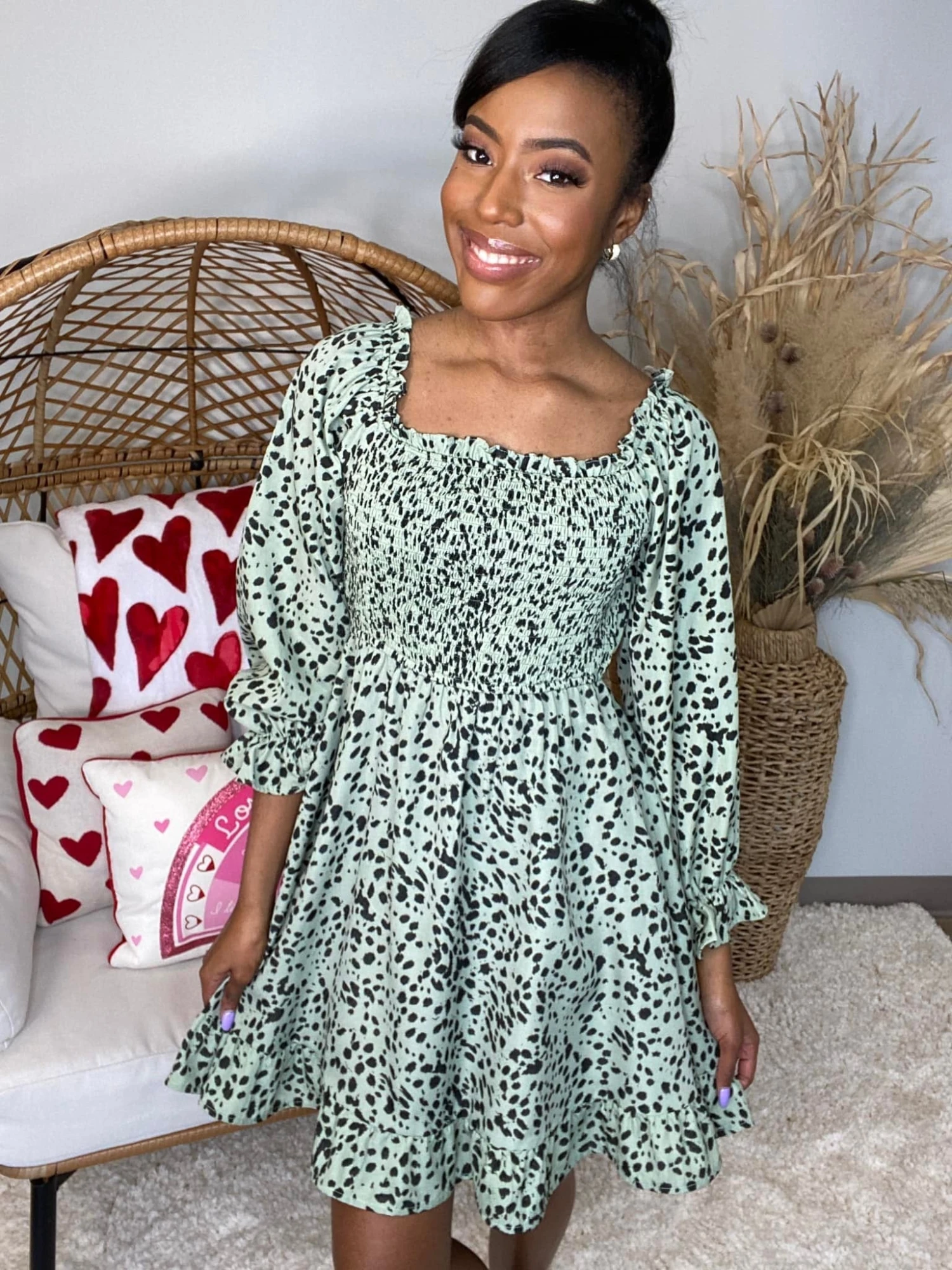Features: Smocked, Baby Doll Dress, Dalmatian Print, Long Sleeves