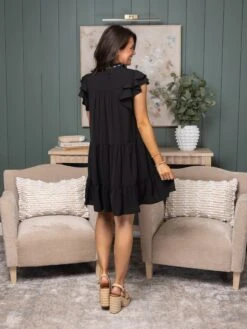 Features: Floral Embroidery, Tiered, Short Ruffle Sleeves, V Neck