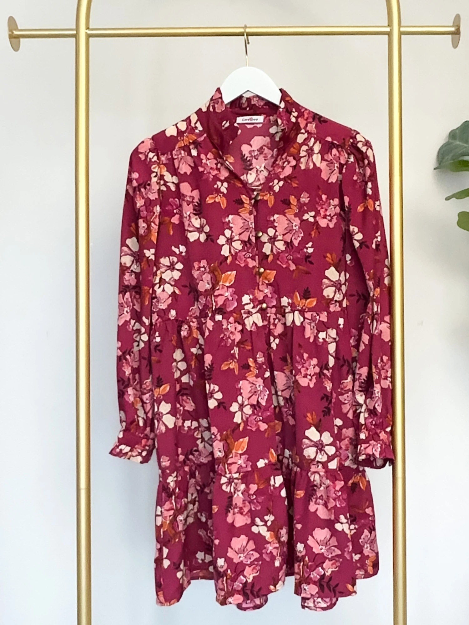 Features: floral print, split v neck, ruffle detail, tiered, summary down, long sleeve