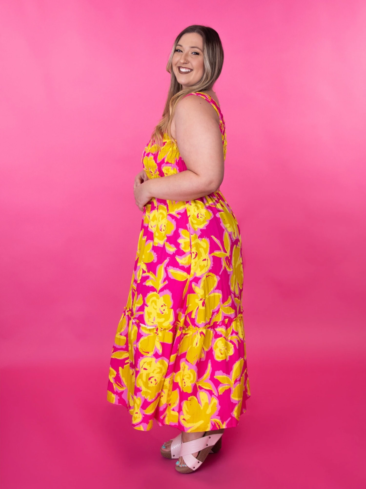 Features: Midi, Smocked, Round Neck, Sleeveless, Floral Print