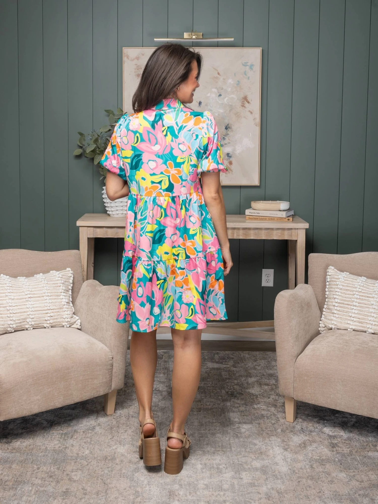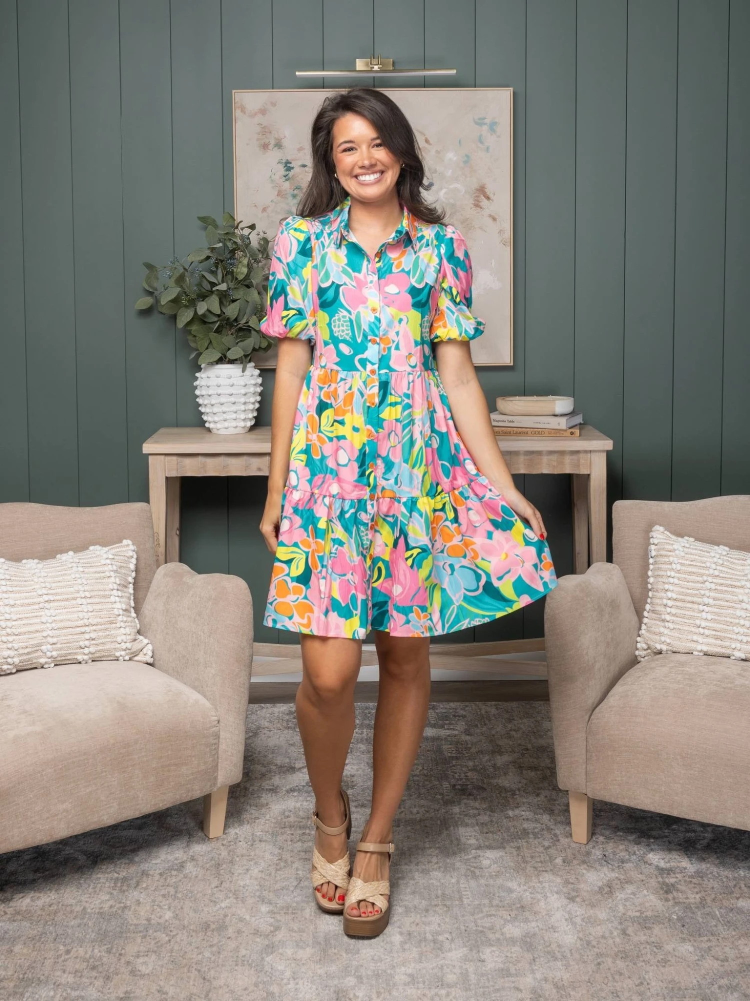 Features:Collared Neck, Elastic Puff Short Sleeves, Button Down Front, Floral Print, Pockets