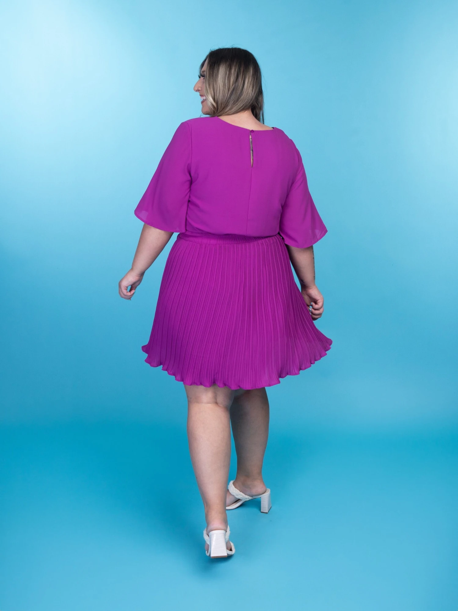 Features: Short Flutter Sleeves, Pleated, Round Neck