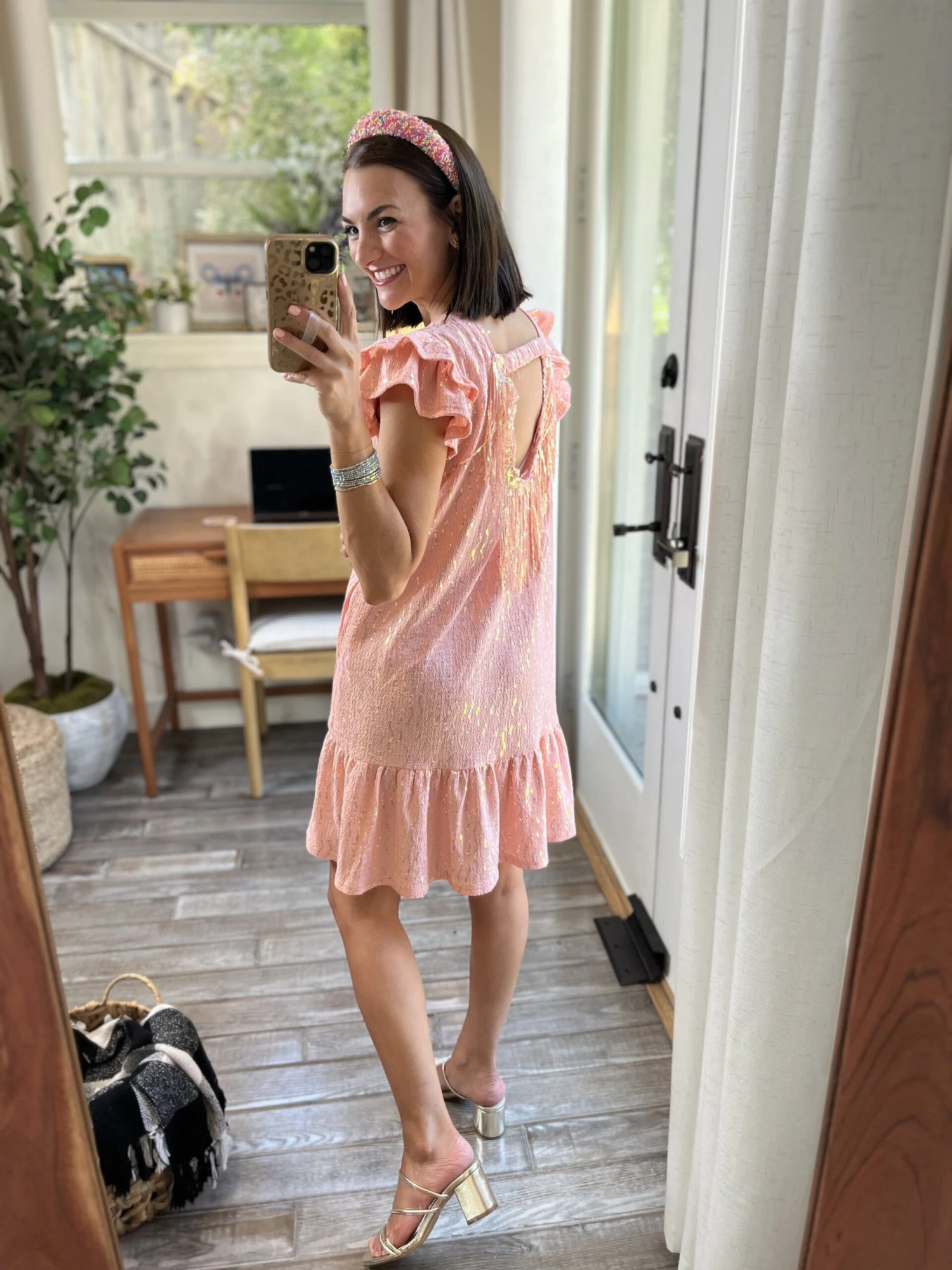 Features: Scoop Neck, Flutter Sleeves, Pockets