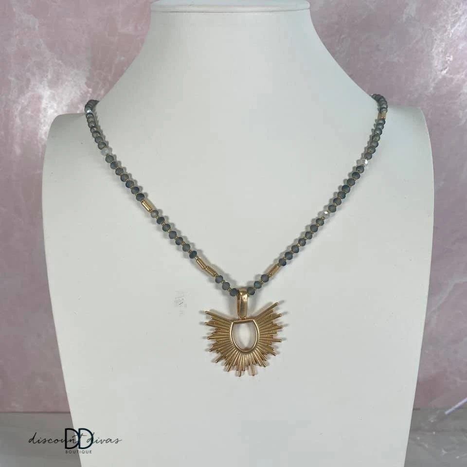 Features: beaded necklace, sunburst cutout pendant