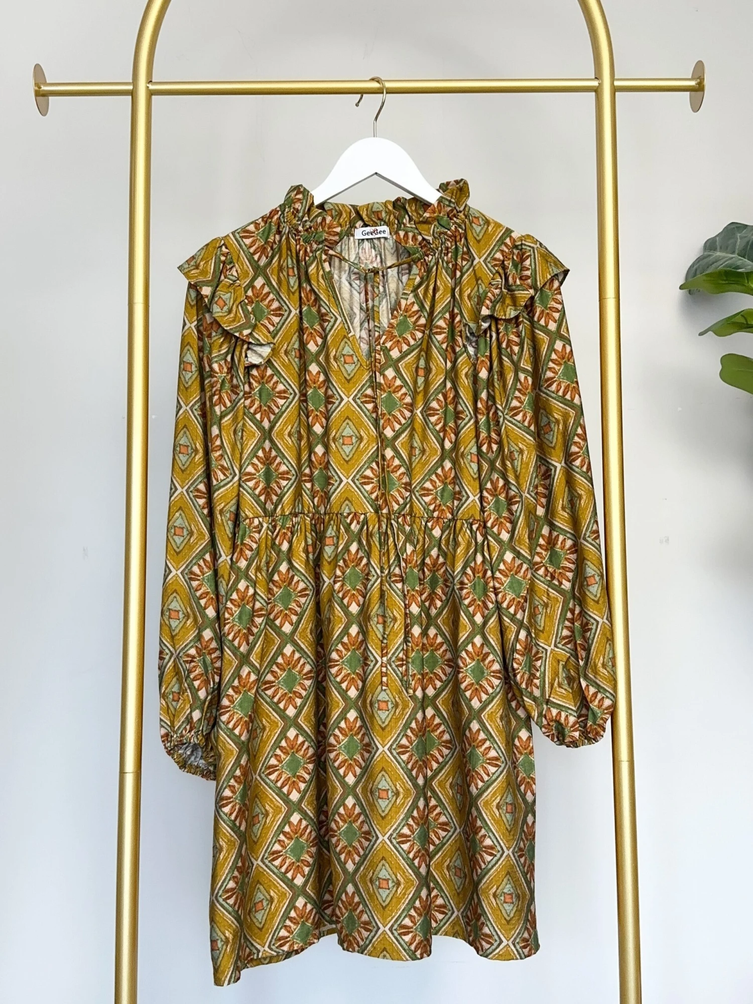 Features: geometric floral print, split v neck w/ tie, long sleeve