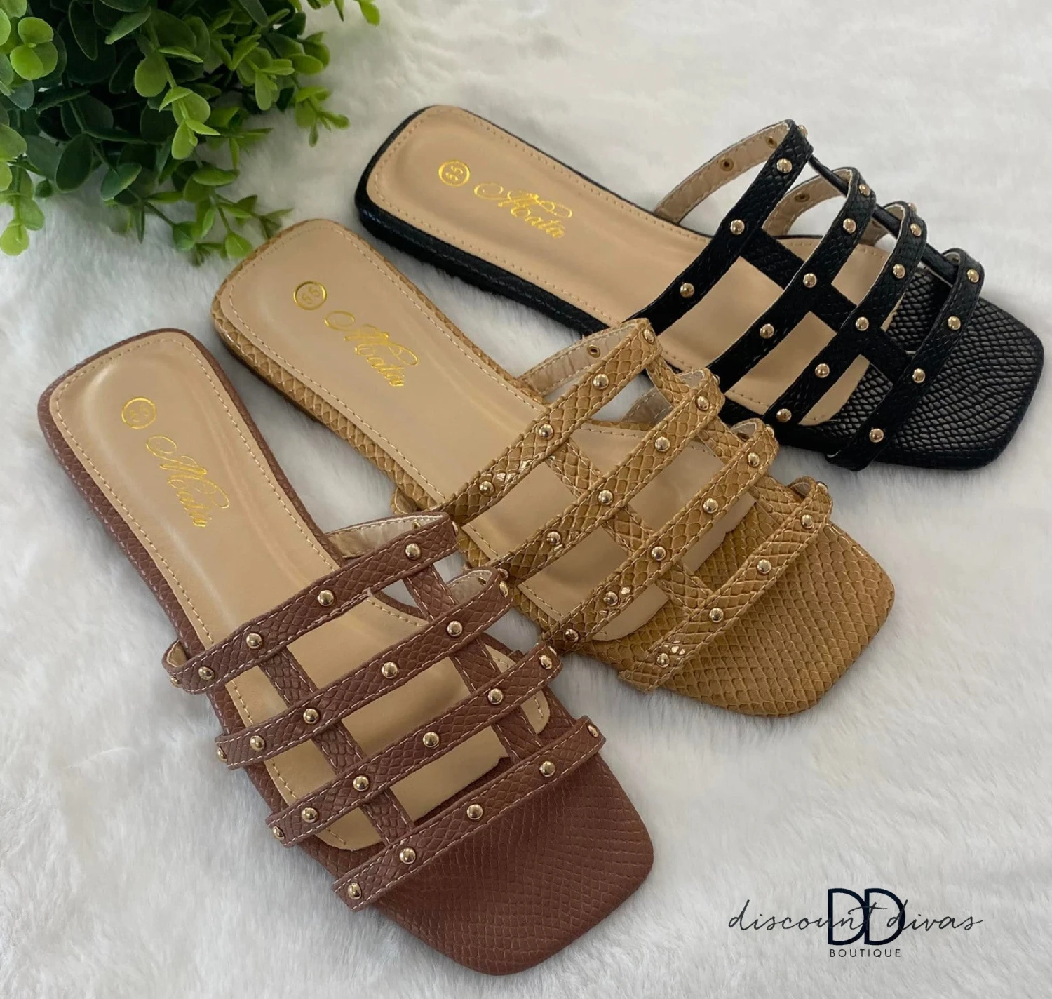 Features: Slip On Sandal, Gold Stud Detail