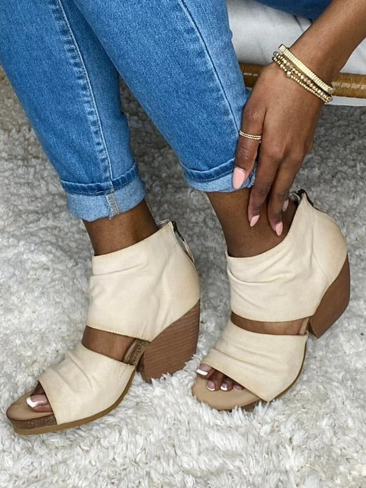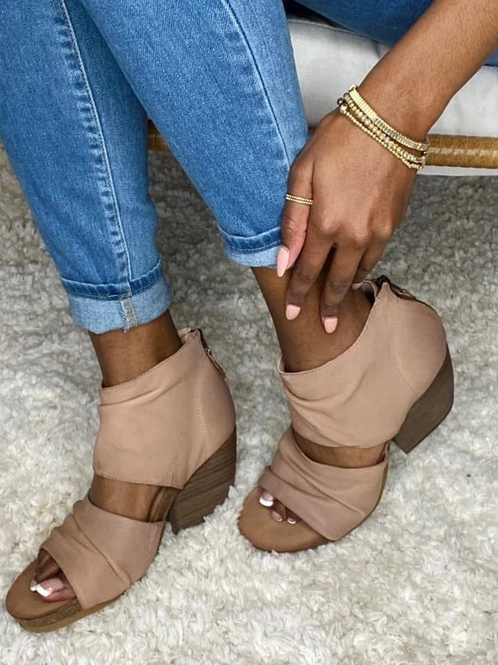 Features: solid print, chunky heel, back zipper