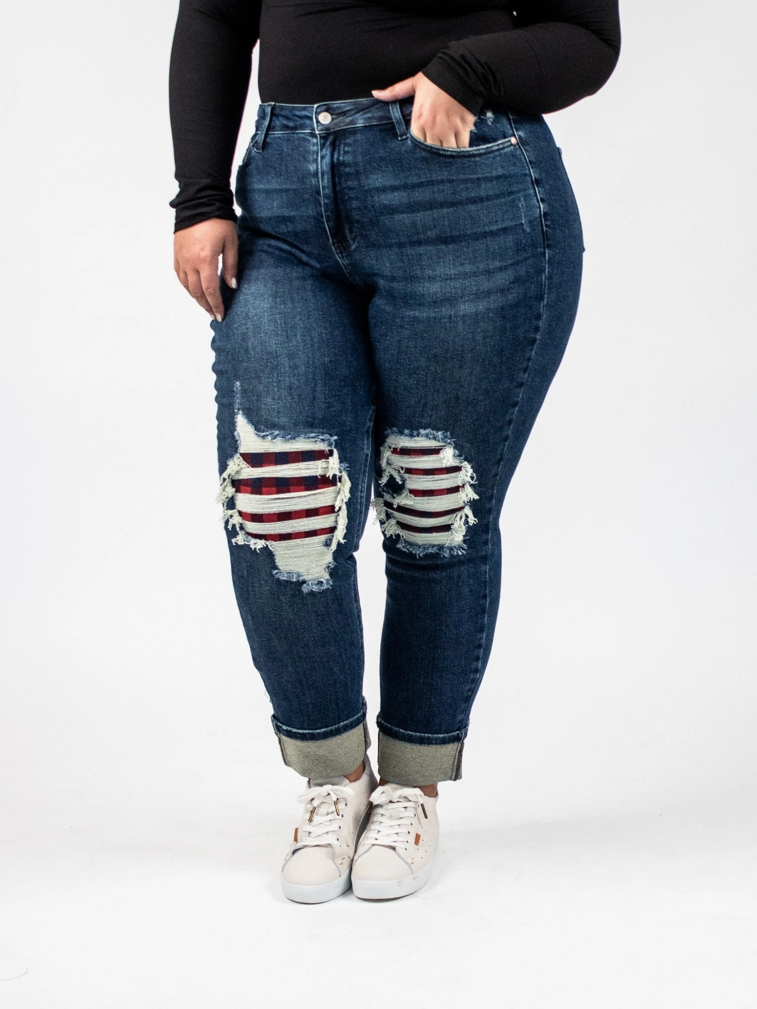 Features: Dark Wash, Mid-Rise, Destroyed Buffalo Plaid Knee Patches, Cuffed