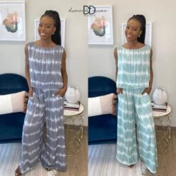 Features: (Bottom) elastic waist, side pockets, flare bottoms (Top) round neck, sleeveless