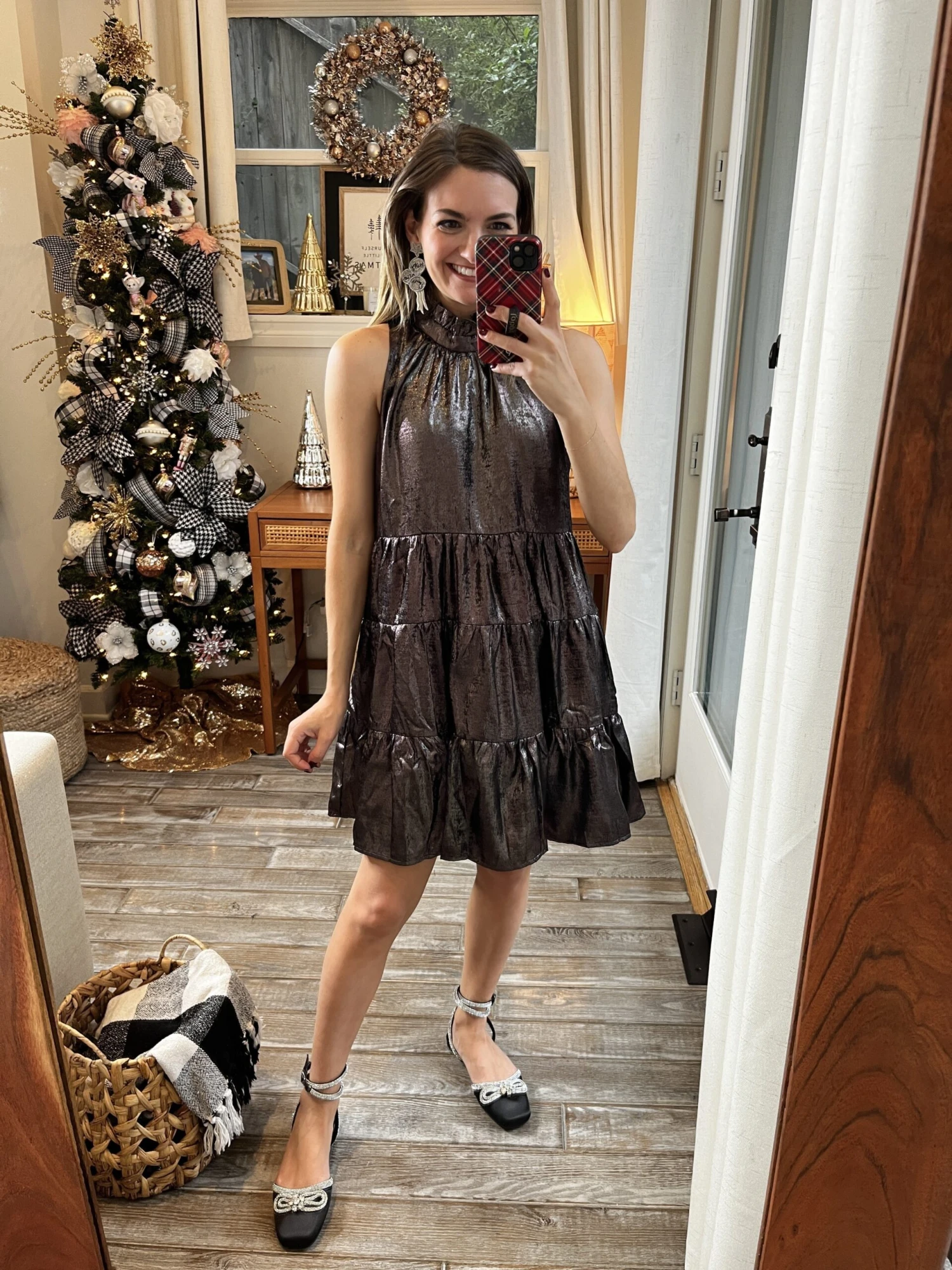 Features: metallic solid print, sleeveless, round neck w/ ruffle detail, tiered