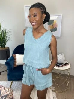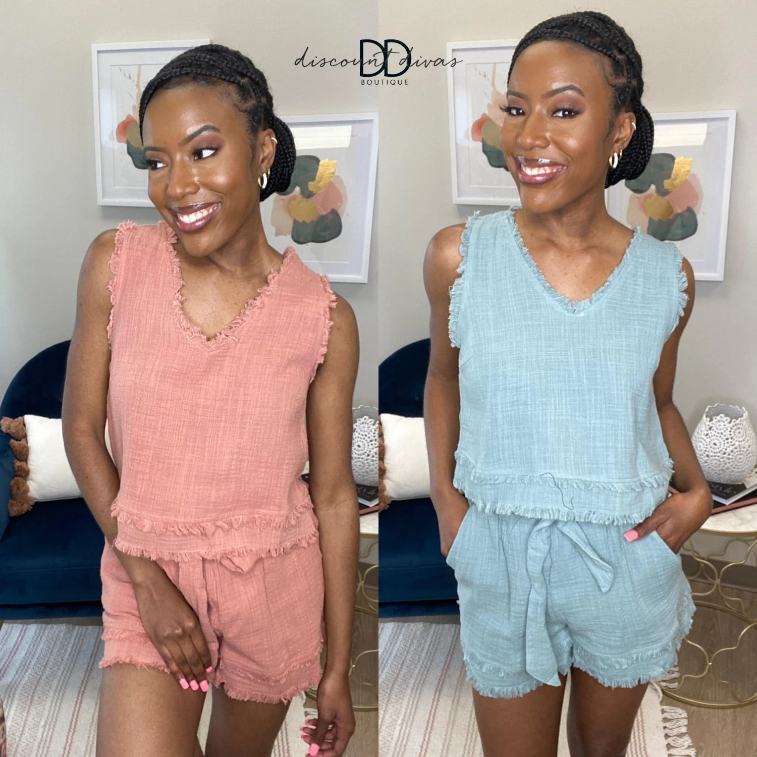 The “Pack A Bag Set” has arrived! This frayed detailed set is a must have! With a gorgeous shirt and shorts with functional pockets, you cannot go wrong here! Snag one before they sell out, you know they will!