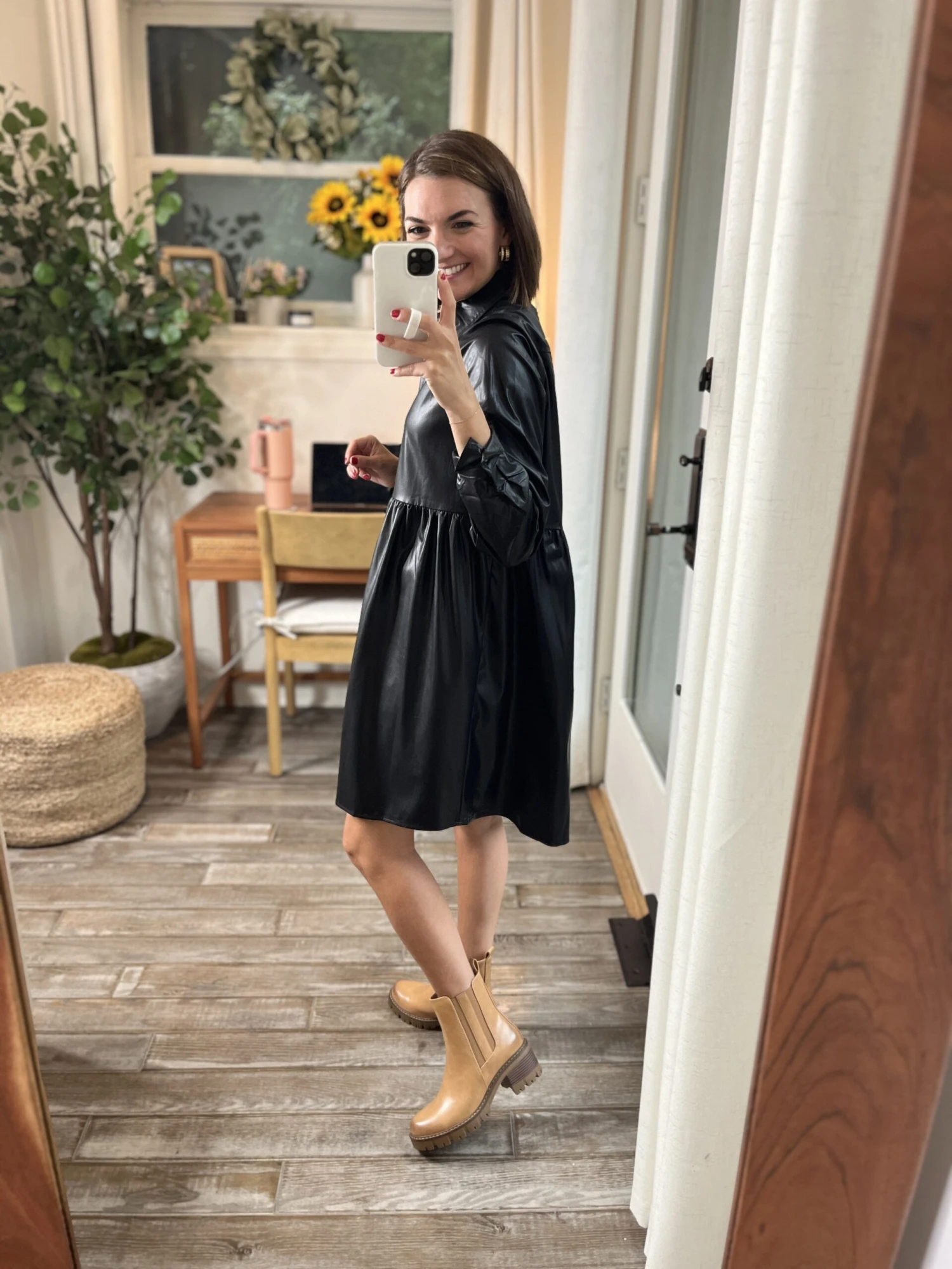 Features: solid pleather print, long sleeve, collared, summary up