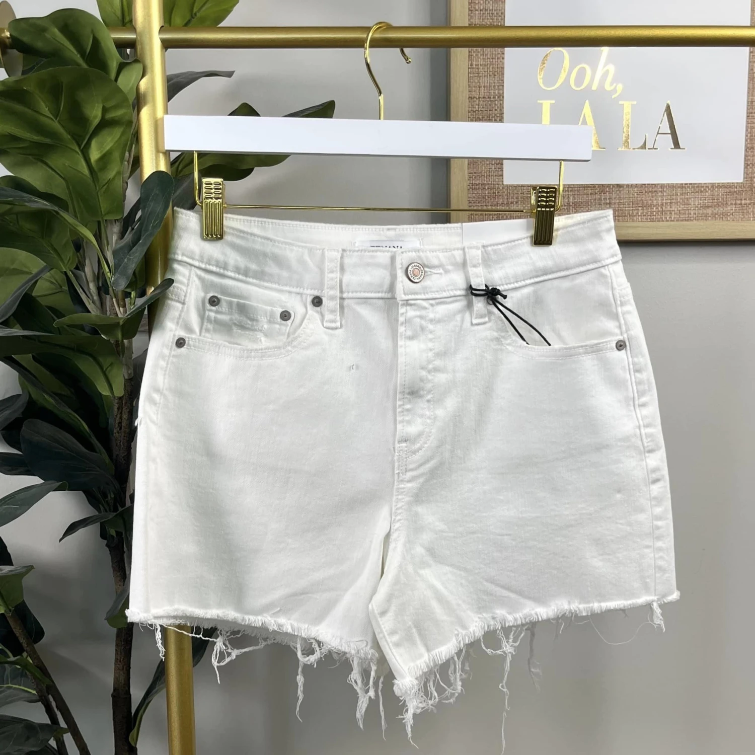 Features: white denim wash, raw hem
