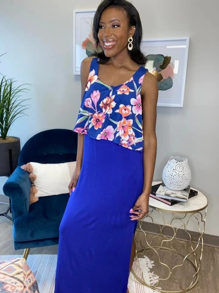 Features: Round Neck, Sleeveless, Floral Print Detail, Solid Maxi, Side Slit, Side Pockets
