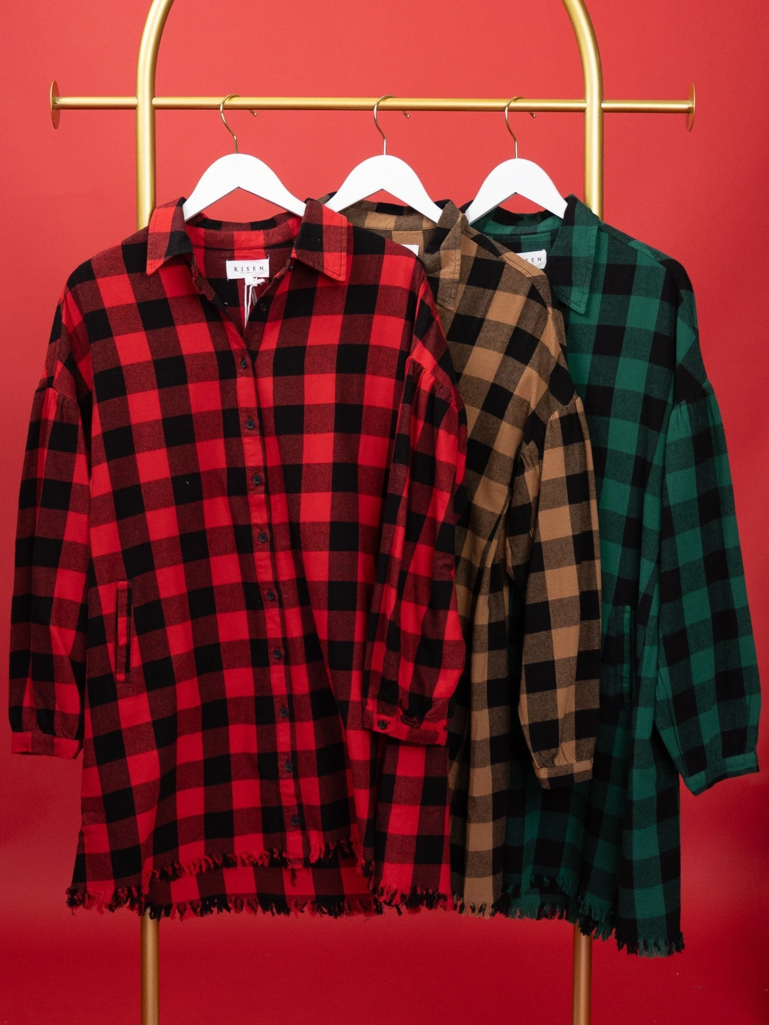 Features: Plaid Print, Oversized, Collared, Button Down, Frayed Hem, Front Pockets