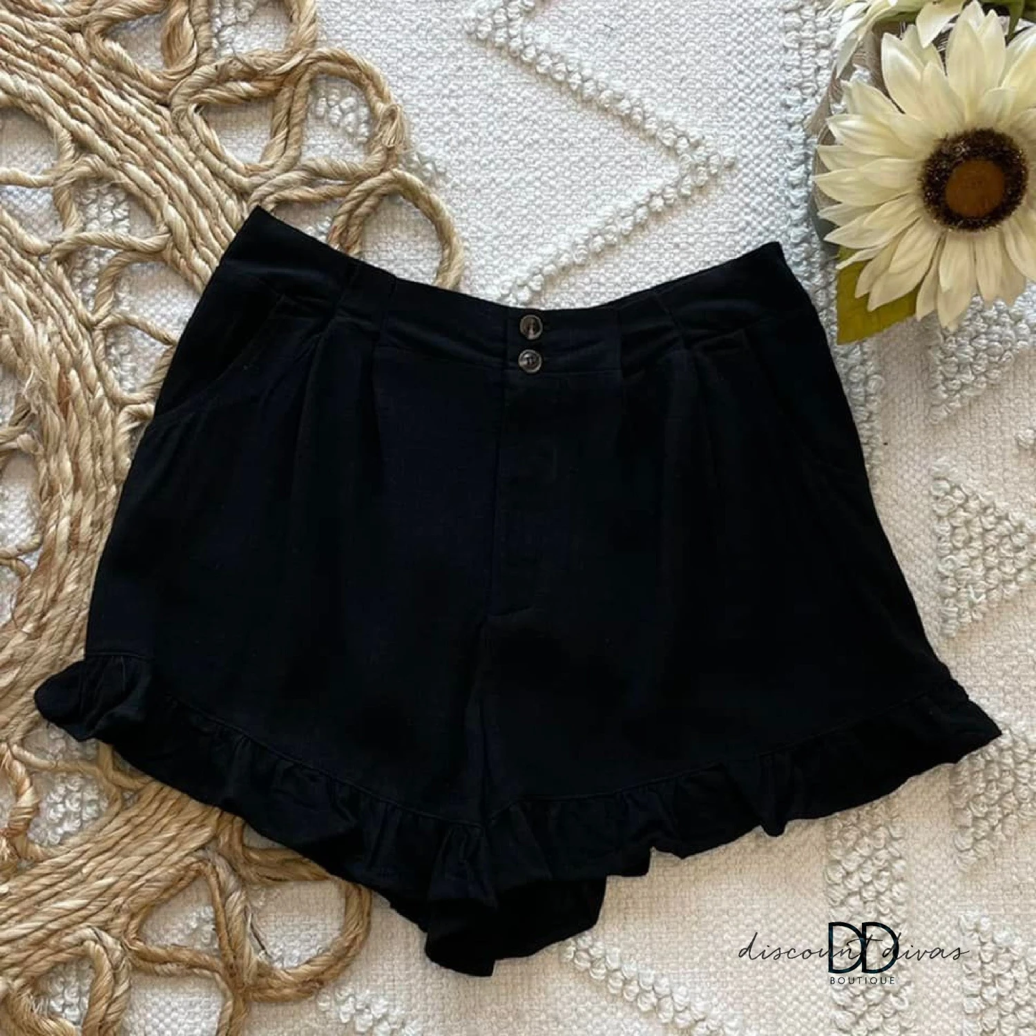 Features: 2 summary fly, side pockets, ruffle hem