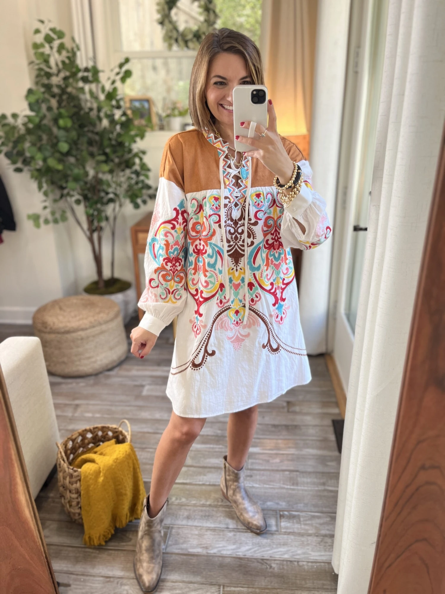 Features: Round Neck with Front Tie, Long Sleeves, Lined, Printed
