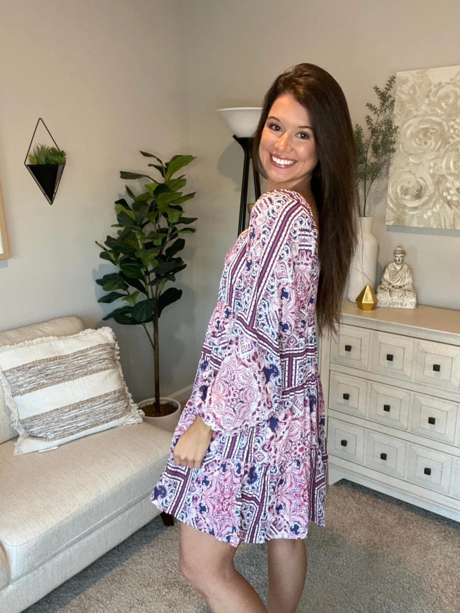 Features: bohemian patchwork print, long bubble sleeves, square neck, tiered, elastic detail