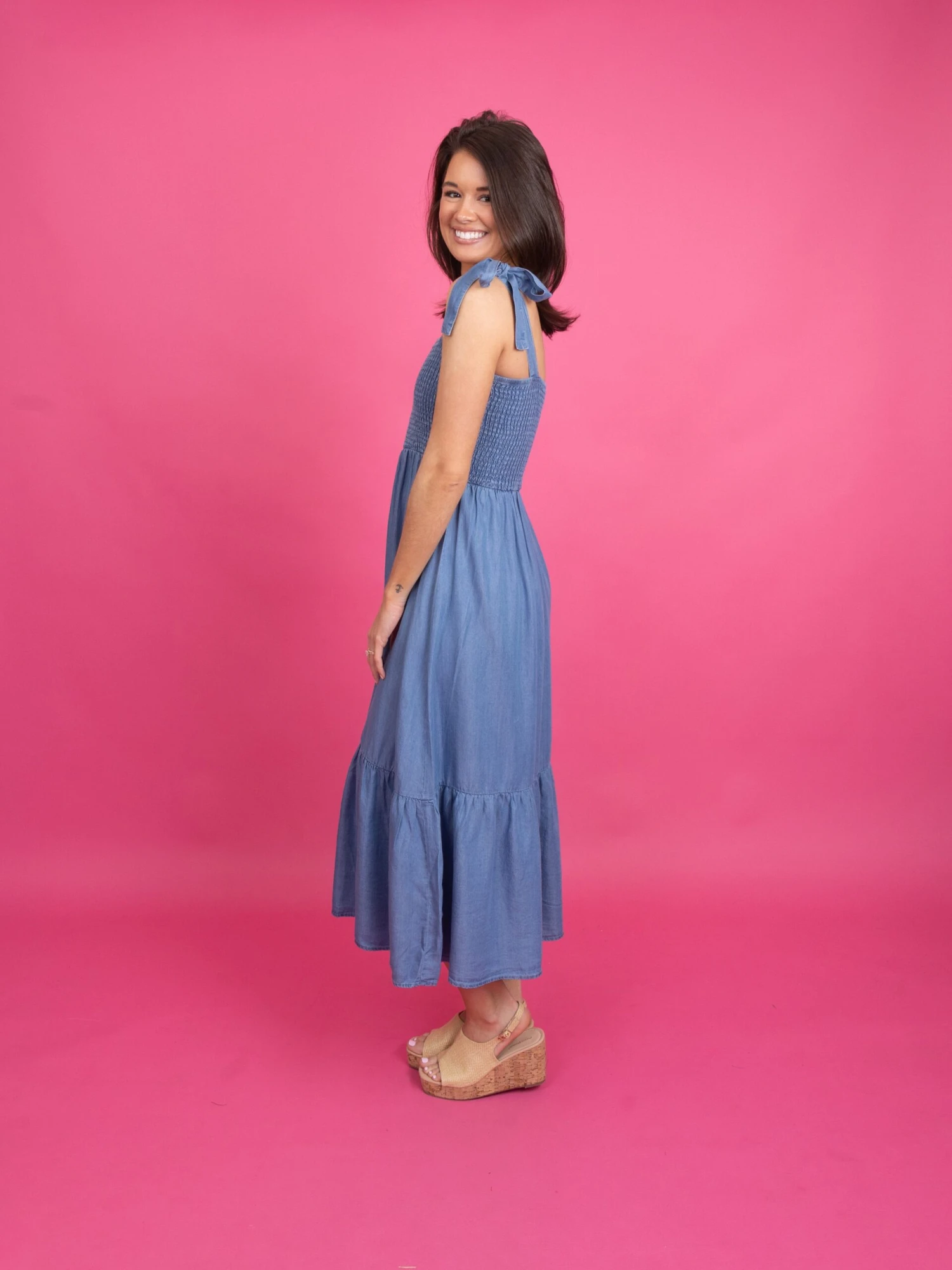 Features: Tie Straps, Smocked, Midi, Sleeveless