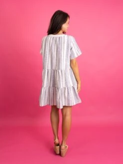Features: Short Sleeve, Split V Neck, Tied, Tiered, Striped