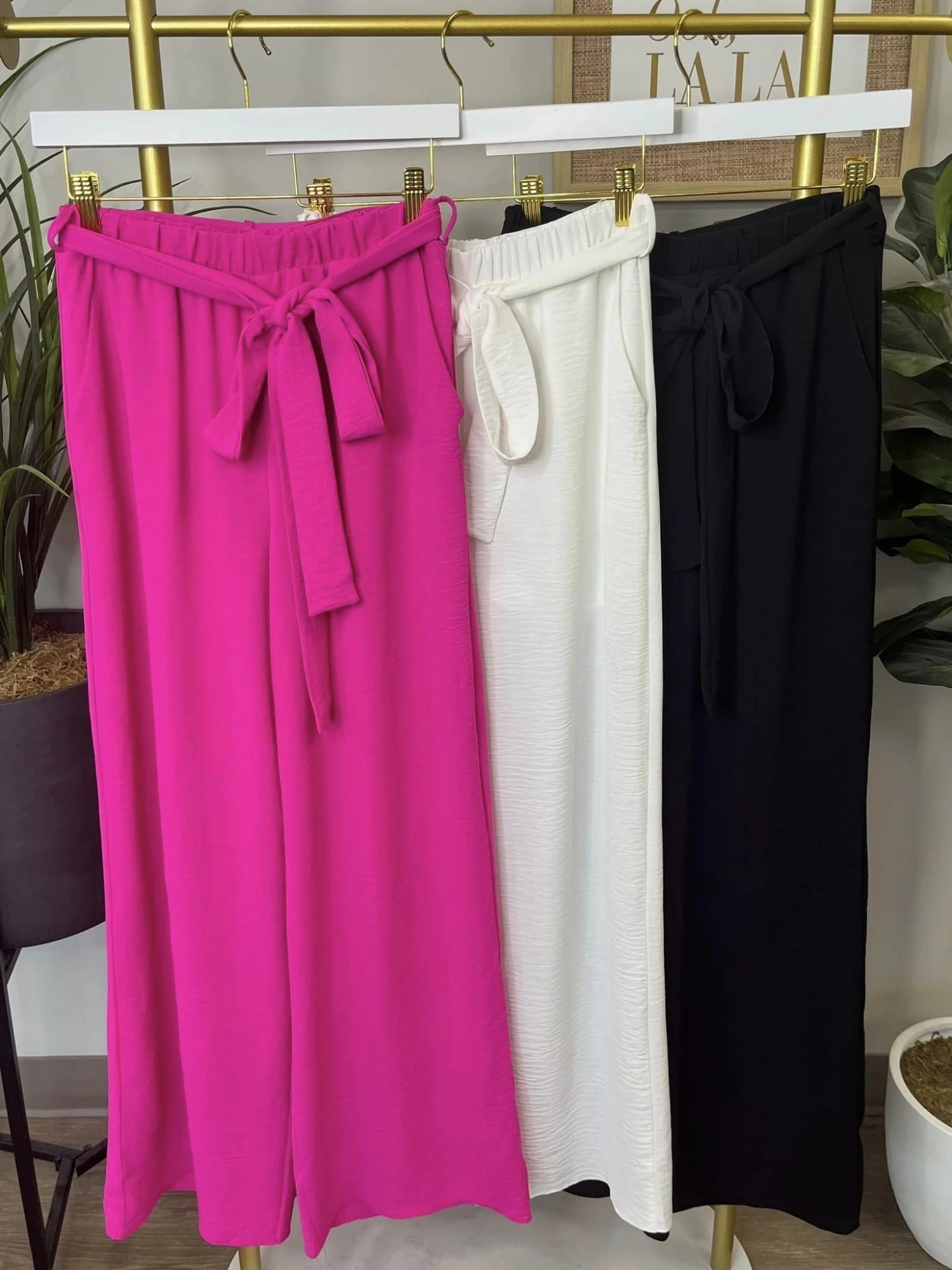 Features:solid print, elastic waist w/ belt, wide leg, side pockets