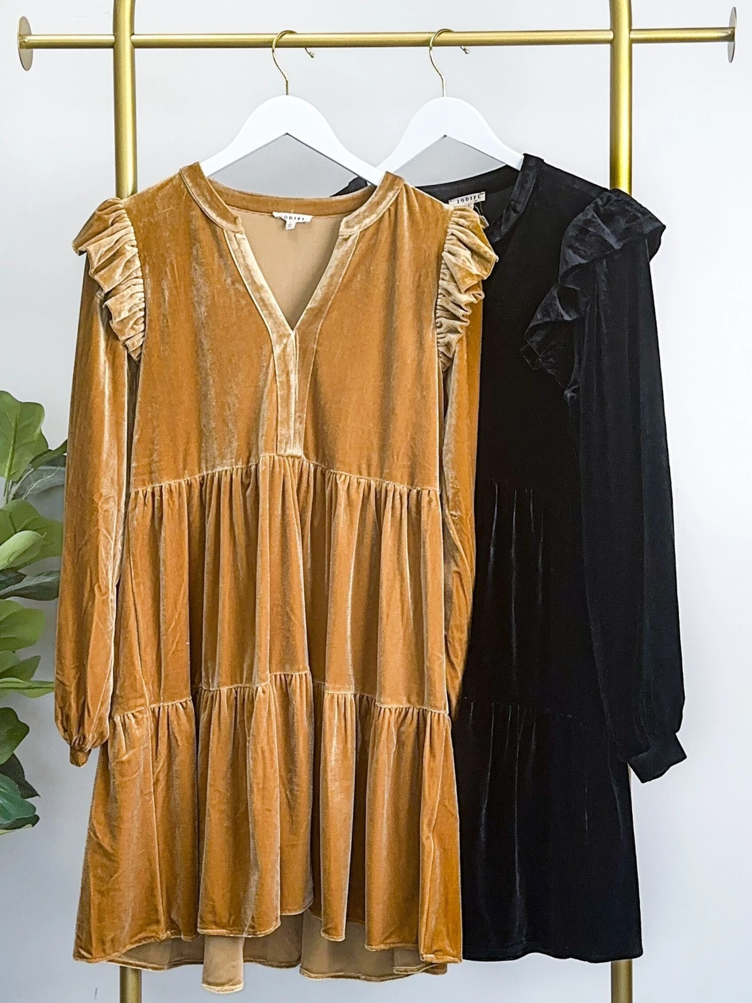 Features: velvet solid print, ruffled cap shoulders, long sleeve, tiered, split v neck