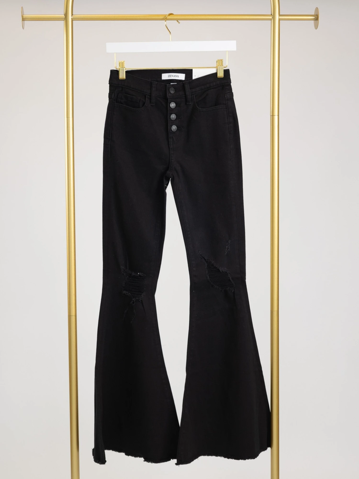 Features: Distressing, Bell Bottom, High Rise